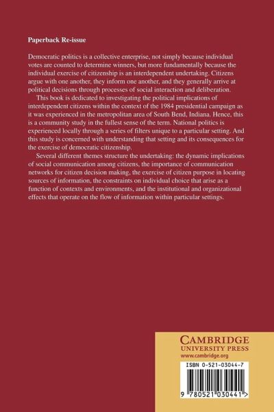 Democratic politics is a collective enterprise, not simply because individual votes are counted to determine winners, but more fundamentally because the individual exercise of citizenship is an interdependent undertaking. Citizens argue with one another and they generally arrive at political decisions through processes of social interaction and deliberation. This book is dedicated to investigating the political implications of interdependent citizens within the context of the 1984 presidential campaign as it was experienced in the metropolitan area of South Bend, Indiana. Hence this is a community study in the fullest sense of the term. National politics is experienced locally through a series of filters unique to a particular setting and its consequences for the exercise of democratic citizenship.