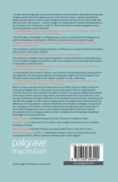 The last decade has witnessed the publication of major qualitative comparative studies of citizens' views and experiences of European integration. None can match, however, Overlooking Europe's theoretical and methodological rigor, nor its intellectual honesty. In a rare instance of genuine and successful collective work, the authors demonstrate and provide a highly sophisticated and original account of the ordinary citizens' cognitive and affective distancing with respect to the European integration process on the eve of Europe's 2008 debt and fiscal crisis. This account largely contradicts previous conclusions drawn from the analysis of public opinion survey data and forever changes our interpretation of political developments in the European Union since the late 1980s. Definitely a 'must' for those interested in European integration and in learning qualitative research methods."