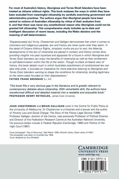 This is the first comprehensive study of the ways in which Aborigines and Torres Strait Islanders have been excluded from the rights of Australian citizenship over the past 100 years. Drawing extensively upon archival material, the authors look at how the colonies initiated a policy of exclusion that was then replicated by the Commonwealth and State governments following federation. The book includes careful examination of government policies and practice from the 1880s to the 1990s and argues that Aboriginal people have been central to notions of Australian citizenship by virtue of their exclusion from it. It overturns many assumptions and misunderstandings, arguing that there was never any constitutional reason why Aborigines could not be granted full citizenship. The authors show that citizenship was an empty term used to discriminate systematically against Aboriginal people.