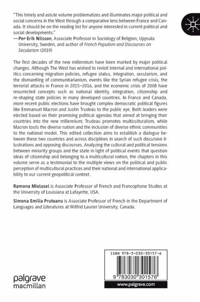 The first decades of the new millennium have been marked by major political changes. Although The West has wished to revisit internal and international politics concerning migration policies, refugee status, integration, secularism, and the dismantling of communitarianism, events like the Syrian refugee crisis, the terrorist attacks in France in 2015-2016, and the economic crisis of 2008 have resurrected concepts such as national identity, integration, citizenship and re-shaping state policies in many developed countries. In France and Canada, more recent public elections have brought complex democratic political figures like Emmanuel Macron and Justin Trudeau to the public eye. Both leaders were elected based on their promising political agendas that aimed at bringing their countries into the new millennium; Trudeau promotes multiculturalism, while Macron touts the diverse nation and the inclusion of diverse ethnic communities to the national model. This edited collection aims to establish a dialogue between these two countries and across disciplines in search of such discursive illustrations and opposing discourses. Analyzing the cultural and political tensions between minority groups and the state in light of political events that question ideas of citizenship and belonging to a multicultural nation, the chapters in this volume serve as a testimonial to the multiple views on the political and public perception of multicultural practices and their national and international applicability to our current geopolitical context.