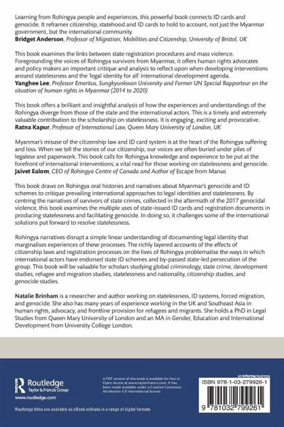 This book draws on Rohingya oral histories and narratives about Myanmar's genocide and ID schemes to critique prevailing international approaches to legal identities and statelessness. By centring the narratives of survivors of state crimes, collected in the aftermath of the 2017 genocidal violence, this book examines the multiple uses of state-issued ID cards and registration documents in producing statelessness and facilitating genocide. In doing so, it challenges some of the international solutions put forward to resolve statelessness.