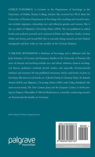 GÖKÇE YURDAKUL is Assistant Professor in the Department of Sociology at Brock University, Canada. She received her Ph.D. from the University of Toronto. Her teaching and research interests include migration, citizenship, race and ethnicity, gender, and women. She has published in edited books and academic journals, such as Journal of Ethnic and Migration Studies, German Politics and Society and Soziale Welt. She is now doing research on how Turkish immigrants and Jews relate to one another in the German diaspora. Y. MICHAL BODEMANN is Professor of Sociology at the University of Toronto, Canada. Today, his areas of research and teaching include race and ethnic relations, classical sociological theory, qualitative methods, Jewish studies, and especially German-Jewish relations and memory. He has published numerous articles and books on Jews in Germany, notably his book, Gedächnistheater. Die jüdische Gemeinschaft und ihre deutsche Erfindung, ( Theatre of Memory. The Jewish Community and its German Invention, 1996). He is conducting further research on Jews in contemporary Germany. His most recent monograph is A Jewish Family in Germany Today: An Intimate Portrait (Duke University Press, 2004). Gökçe Yurdakul and Michal Bodemann are the editors of Migration, Citizenship, Ethnos (Palgrave Macmillan, 2006).