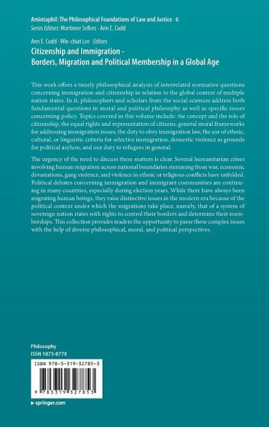 1 Introduction; Ann E. Cudd and Win-Chiat Lee.- Part I Conceptions of Citizenship.- 2 National Citizenship and Civil Marriage: Ascriptive and Consensual Models; Emily R. Gill.- 3 Citizens as Artifacts; Wade L. Robison.- 4 Cosmopolitan Citizenship; Steven P. Lee.- 5 The Expansion of Kant's Republicanism with Active Citizenship; Yi Deng.- 6 Public Interests and the Duty of Food Citizenship; Joan McGregor.- Part II Citizenship and Equal Rights.- 7 Equal Citizenship and Religious Liberty: An Irresolvable Tension?; Gordon A. Babst and John W. Compton.- 8 Who Else Should Vote in Local Decision-Making? Enfranchising Part Time Residents and Non-Citizens; John G. Francis.- Part III Moral Frameworks for Immigration Issues.- 9 John Locke on Naturalization and Natural Law: Community and Property in the State of Nature; Laurence D. Houlgate.- 10 Immigration, Citizenship, and the Clash between Partiality and Impartiality; Stephen Nathanson.- 11 Reconciling the Virtues of Humanity and Respect for the Rule of Law: Irregular Immigration from the Perspective of Humean Virtue Ethics; Kenneth Henley.- 12 Human Rights, Distributive Justice, and Immigration; Alistair M. Macleod.- Part IV Immigration and the Ethics of Exclusion.- 13 On Nonmembers' Duty to Obey Immigration Law: A Problem of Political Obligation; Win-Chiat Lee.- 14 "Where Are You Really From?" Ethnic and Linguistic Immigrant Selection Policies in Liberal States; Adam Hosein.- 15 Restricting Immigration Fairly; Bruce Landesman.- Part V Asylum and Refugee Policy.- 16 Domestic Violence as Justification for Asylum; Ann E. Cudd.- 17 If We Were Just We Would Provide Refuge for All; T. Nicolaus Tideman.- Author Bios.