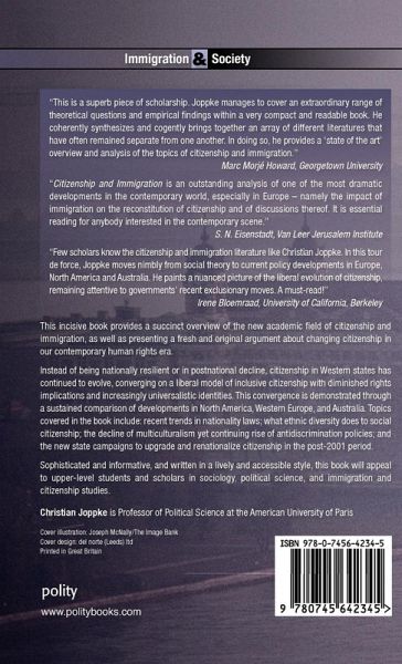 "This is a superb piece of scholarship. Joppke manages to cover an extraordinary range of theoretical questions and empirical findings within a very compact and readable book. He coherently synthesizes and cogently brings together an array of different literatures that have often remained separate from one another. In doing so, he provides a 'state of the art' overview and analysis of the topics of citizenship and immigration." Marc Morjé Howard, Georgetown University "Citizenship and Immigration is an outstanding analysis of one of the most dramatic developments in the contemporary world, especially in Europe - namely the impact of immigration on the reconstitution of citizenship and of discussions thereof. It is essential reading for anybody interested in the contemporary scene." S. N. Eisenstadt, Van Leer Jerusalem Institute "Few scholars know the citizenship and immigration literature like Christian Joppke. In this tour de force, Joppke moves nimbly from social theory to current policy developments in Europe, North America and Australia. He paints a nuanced picture of the liberal evolution of citizenship, remaining attentive to governments' recent exclusionary moves. A must-read!" Irene Bloemraad, University of California, Berkeley This incisive book provides a succinct overview of the new academic field of citizenship and immigration, as well as presenting a fresh and original argument about changing citizenship in our contemporary human rights era. Instead of being nationally resilient or in postnational decline, citizenship in Western states has continued to evolve, converging on a liberal model of inclusive citizenship with diminished rights implications and increasingly universalistic identities. This convergence is demonstrated through a sustained comparison of developments in North America, Western Europe, and Australia. Topics covered in the book include: recent trends in nationality laws; what ethnic diversity does to social citizenship; the decline of multiculturalism yet continuing rise of antidiscrimination policies; and the new state campaigns to upgrade and re-nationalize citizenship in the post-2001 period. Sophisticated and informative, and written in a lively and accessible style, this book will appeal to upper-level students and scholars in sociology, political science, and immigration and citizenship studies.