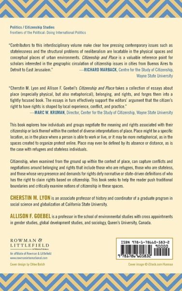 This book explores the ways in which individuals and groups negotiate the meaning and rights associated with their citizenship or lack thereof within the context of diverse interpretations of "place." Place might be a specific location as in the place where a person is able to work, or live, or it may be more metaphorical, as in the spaces created to organize protest online. Place may even be defined by its absence or distance, as is the case with refugees and stateless individuals. Chapters in the first half of the book examine citizenship and place within the city. The second half examines citizenship and place beyond the city, beyond the nation, and in the case of statelessness, even beyond citizenship. The volume ends with a chapter that asserts that all citizenship is local. Citizenship, when examined from the ground up within the context of place, can capture conflicts and negotiations around belonging and rights that include those who are refugees, those who are stateless, and those whose very presence and demand for rights defy normative or state-driven definitions of who has the right to claim rights based on citizenship. This book seeks to help the reader push traditional boundaries and critically examine notions of citizenship in these spaces.
