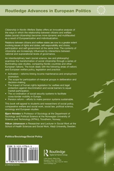 This book offers an innovative analysis of the ways in which the relationship between citizens and welfare states - social citizenship - becomes more dynamic and multifaceted as a result of Europeanization and individualization. Written by interdisciplinary contributors from politics, sociology, law and philosophy, it examines the transformation of social citizenship through a series of illuminating case studies, comparing Nordic countries and other European nations. Dealing with the following areas of national and European welfare policy, legislation and practice: activation - reforms linking income maintenance and employment promotion scope for participation of marginal groups in deliberation and decision-making impact of human rights legislation for welfare and legal protection against discrimination and social barriers to equal market participation coordination of social security systems to facilitate cross-border mobility in Europe pension reform - efforts to make pension systems sustainable. Citizenship in Nordic Welfare States will be of interest to students and researchers of social policy, comparative welfare, social law, political science, sociology and European studies.