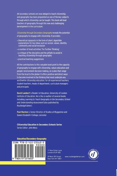 This book reveals the potential of geography to engage with citizenship. It provides: theoretical signposts in the form of short, digestible explanations for key ideas such as racism, values, identity, community and social exclusion a number of inset activities 'for further thinking' a critique of the discipline and the pitfalls to avoid in teaching citizenship through geography practical teaching suggestions. All the contributions to this valuable book point to the capacity of geography to engage with citizenship, values, education and people - environment decision-making, on scales that range from the local to the global. It offers positive and direct ways to become involved in the thinking that must underpin any worthwhile citizenship education, for all experienced teachers, student teachers, heads of department, curriculum managers, principals and policy-makers.