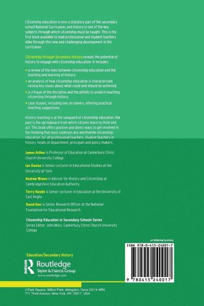 Citizenship through Secondary History reveals the potential of history to engage with citizenship education and includes: a review of the links between citizenship education and the teaching and learning of history an analysis of how citizenship education is characterised, raising key issues about what could and should be achieved a critique of the discipline and the pitfalls to avoid in teaching citizenship through history case studies offering practical teaching suggestions. History teaching is at the vanguard of citizenship education - the past is the springboard from which citizens learn to think and act. This book offers positive and direct ways to get involved in the thinking that must underpin any worthwhile citizenship education, for all professional teachers, student teachers in history, policy-makers, heads of department and principals.