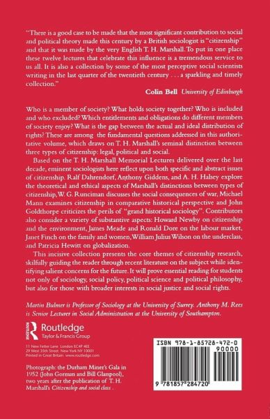 T.H.Marshall and the progress of citizenship Anthony M. Rees; citizenship and social class Ralf Dahrendorf; why social inequalities are generated by social rights W.G. Runciman; T.H. Marshall the state and democracy Anthony Giddens; T.H. Marshall and ethical socialism A.H. Halsey; the uses of history in sociology - reflections on some recent tendencies John H. Goldthorpe; ruling class strategies and citizenship Michael Mann; full employment new technologies and the distribution of income James Meade; citizenship and employment in an age of high technology Ronald P. Dore; family responsibilities and rights Janet Finch; citizenship in a green world - global commons and human stewardship Howard Newby; the poorest of the urban poor - race class and social isolation in America's inner city ghetto William Julius Wilson; social justice in a global economy? Patricia Hewitt; citizenship in the 21st century Martin Bulmer Anthony M. Rees.