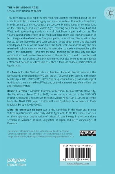 This open access book explores how medieval societies conversed about the city and citizen in texts, visual imagery and material culture. It adopts a long-term, interdisciplinary, and cross-cultural perspective, bringing together contributions on the early, high, and later Middle Ages, covering both the medieval East and West, and representing a wide variety of disciplinary angles and sources. The volume is first and foremost about medieval perceptions and their articulation in text, image and material form. The principal focus is not on cities or citizenship per se, but on those who used such concepts, wrote about them, and visualized and depicted them. At the same time, the book seeks to address why the city remained such a salient concept also in non-urban contexts - the periphery, the desert, the monastery - and how medieval thinking on the ideal city and civic community could involve denunciation of the earthly city and its institutional trappings. It thus pushes scholarly boundaries, but also seeks to escape deeply entrenched notions of citizenship as either a form of political participation or legal status.