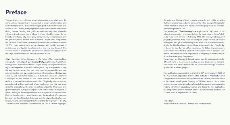 The city of Lviv in western Ukraine has been undergoing a process of transformation for several years aimed at modernising its infrastructure and promoting urban development. The challenges the city faced reached an unprecedented level following Russia's full scale invasion in February 2022. Lviv quickly became a critical hub for hundreds of thousands of people fleeing the war-torn regions of eastern Ukraine. The city was tasked with mitigating the immediate effects of the war while developing resilient structures to sustain this role in the short, medium, and long term. Even before the war, the city fostered smart dialogue between research and practice in local and international contexts. Through their Academic Cooperation Programme, the Faculties of Architecture at Lviv Polytechnic National University and TU Wien contribute to this continuous dialogue. This book discusses practical and academic proposals for the urban transformation of Lviv, particularly during the ongoing crisis. It thereby offers valuable insights for urbanists, architects, city managers, policy makers, entrepreneurs, and the general public.