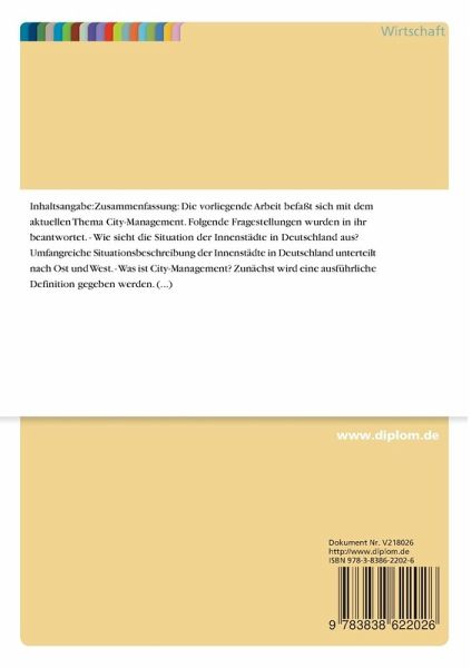Inhaltsangabe:Zusammenfassung: Die vorliegende Arbeit befaßt sich mit dem aktuellen Thema City-Management. Folgende Fragestellungen wurden in ihr beantwortet. - Wie sieht die Situation der Innenstädte in Deutschland aus? Umfangreiche Situationsbeschreibung der Innenstädte in Deutschland unterteilt nach Ost und West. - Was ist City-Management? Zunächst wird eine ausführliche Definition gegeben werden. Da dies nicht einfach ist werden zunächst Grundlagen des Managements und des Marketings erläutert. Danach werden verwandte Begriffe erläutert und der Begriff des City-Managements abgegrenzt. - Welche relevanten Faktoren spielen bei einem erfolgreichen City-Management eine wichtige Rolle? 11 Faktoren, die für ein City-Management eine wichtige Rolle spielen werden erläutert und kritisch betrachtet - Welche Städte betreiben in Deutschland City-Management? Tabellarische Aufzählung und Unterteilung nach Organisationsstruktur, Finanzierung, Ziele, Probleme etc. derjenigen Städte in Deutschland, die City-Management betreiben, - Wie sind bisher City-Managementprojekte verlaufen? Vier Beispiele (Hamm, Ingolstadt, Jena, Lübeck) aus der Praxis veranschaulichen das Instrument des City-Managements und ermöglichen eine kritische Bewertung - Wie ist der Stand des Citymanagements in Augsburg? Ausführlich wird die gegebene Situation in Augsburg erläutert. Das City-Managementkonzept wird betrachtet; Perspektiven werden ebenso aufgezeigt, wie auch konkrete Vorschläge. Inhaltsverzeichnis:Inhaltsverzeichnis: Abbildungsverzeichnis9 Tabellenverzeichnis10 Fotoverzeichnis10 Kartenverzeichnis11 Teil 1: City-Management in Deutschland I.Einführung12 1.Problemstellung12 2.Fragestellung15 3.Zielsetzung16 3.1Aufbau der Arbeit16 3.2Ziel der Arbeit16 4.Methodische Vorgehensweise17 4.1Literaturanalyse17 4.2Experteninterviews18 4.2.1Experteninterviews in Augsburg19 4.2.2Experteninterview in Dortmund20 4.2.3Experteninterview in Ingolstadt20 4.3.4Experteninterview in Jena21 4.2.5Fragebogen zum Lübeck-Management21 4.2.6Telefonische Befragung22 5.Zusammenfassung25 II:Innenstädte in der Krise27 1.Die Innenstädte von Ost- und Westdeutschland27 2.Die Innenstädte von Ostdeutschland36 3.Die Innenstädte von Westdeutschland41 4.Zusammenfassung42 III.Lösungsstrategie: City-Management44 1.Begriffserläuterung44 1.1Der Begriff City44 1.2Der Begriff Management45 1.3Abgrenzung zu anderen Begriffen48 1.3.1Der Begriff Marketing49 1.3.1.1Der Begriff [¿]
