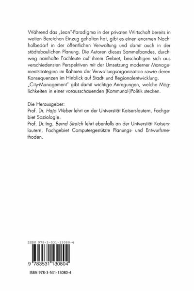 Während das "Lean"-Paradigma in der privaten Wirtschaft bereits in weiten Bereichen Einzug gehalten hat, gibt es einen enormen Nachholbedarf in der öffentlichen Verwaltung und damit auch in der städtebaulichen Planung. Die Autoren dieses Sammelbandes, durchweg namhafte Fachleute auf ihrem Gebiet, beschäftigen sich aus verschiedensten Perspektiven mit der Umsetzung moderner Managementstrategien im Rahmen der Verwaltungsorganisation sowie deren Konsequenzen im Hinblick auf Stadt- und Regionalentwicklung. "City-Management" gibt damit wichtige Anregungen, welche Möglichkeiten in einer vorausschauenden (Kommunal-)Politik stecken.