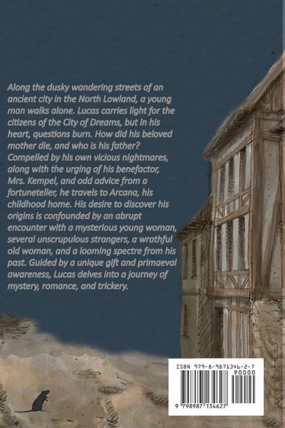 Along the dusky wandering streets of an ancient city in the North Lowland, a young man walks alone. Lucas carries light for the citizens of the City of Dreams, but in his heart questions burn. How did his beloved mother die, and who is his father? Compelled by his own vicious nightmares, along with the urgings of his benefactor Mrs. Kempel, and odd advice from a fortuneteller, he travels to Arcana, his childhood home. His desire to discover his origins is confounded by an abrupt encounter with a mysterious young woman, several unscrupulous strangers, a wrathful old woman, and a looming spectre from his past. Guided by a unique gift and primaeval awareness, Lucas delves into a journey of mystery, romance, and trickery.