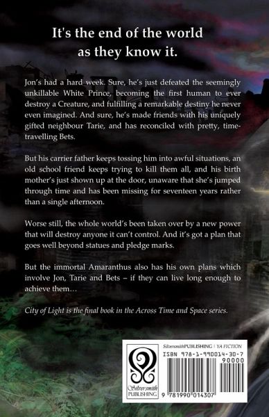 It's the end of the world as they know it. Jon's had a hard week. Sure, he's just defeated the seemingly unkillable White Prince, becoming the first human to ever destroy a Creature, and fulfilling a remarkable destiny he never even imagined. And sure, he's made friends with his uniquely gifted neighbour Tarie, and has reconciled with pretty, time-travelling Bets. But his carrier father keeps tossing him into awful situations, an old school friend keeps trying to kill them all, and his birth mother's just shown up at the door, unaware that she's jumped through time and has been missing for seventeen years rather than a single afternoon. Worse still, the whole world's been taken over by a new power that will destroy anyone it can't control. And it's got a plan that goes well beyond statues and pledge marks. But the immortal Amaranthus also has his own plans which involve Jon, Tarie and Bets - if they can live long enough to achieve them... This is the seventh and final book in the Across Time & Space series: The Eternity Stone Mountain of Glass Desert of Fire Desert of Ice The Hidden Door Whiter than Snow City of Light