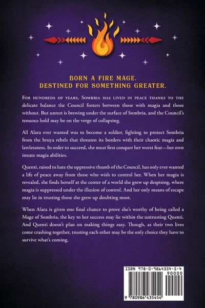 Born a fire mage, destined for something greater. For hundreds of years, Sombria has lived in peace thanks to the delicate balance the Council fosters between those with magic and those without. But unrest is brewing under the surface of Sombria, and the Council's tenuous hold may be on the verge of collapsing. All Alara ever wanted was to become a soldier, fighting to protect Sombria from the bruya rebels that threaten its borders with their chaotic magic and lawlessness. In order to succeed, she must first conquer her worst fear--her own innate magical abilities. Quenti, raised to hate the oppressive thumb of the Council, has only ever wanted a life of peace away from those who wish to control her. When her abilities are revealed, she finds herself at the center of a world she grew up despising, where magic is suppressed under the illusion of control. And her only means of escape may lie in trusting those she grew up doubting most. When Alara is given one final chance to prove she's worthy of being called a Mage of Sombria, the key to her success may lie within the untrusting Quenti. And Quenti doesn't plan on making things easy. Though as their two lives come crashing together, trusting each other may be the only choice they have to survive what's coming.