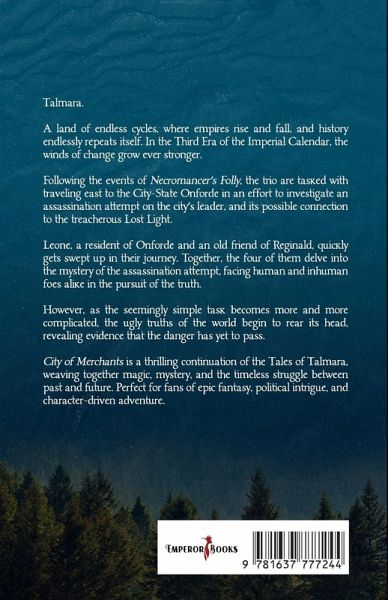 Talmara. A land of endless cycles, where empires rise and fall, and history endlessly repeats itself. In the Third Era of the Imperial Calendar, the winds of change grow ever stronger. Following the events of "Necromancer's Folly", the trio are tasked with traveling east to the City-State Onforde in an effort to investigate an assassination attempt on the city's leader, and its possible connection to the treacherous Lost Light. Leone, a resident of Onforde and an old friend of Reginald, quickly gets swept up in their journey. Together, the four of them delve into the mystery of the assassination attempt, facing human and inhuman foes alike in the pursuit of the truth. However, as the seemingly simple task becomes more and more complicated, the ugly truths of the world begin to rear its head, revealing evidence that the danger has yet to pass. "City of Merchants" is a thrilling continuation of the Tales of Talmara, weaving together magic, mystery, and the timeless struggle between past and future. Perfect for fans of epic fantasy, political intrigue, and character-driven adventure.