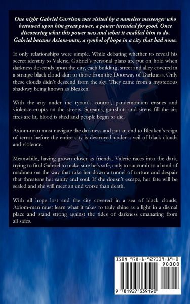 If only relationships were simple. While debating whether to reveal his secret identity to Valerie, Gabriel's personal plans are put on hold when darkness descends upon the city, each building, street and alley covered in a strange black cloud akin to those from the Doorway of Darkness. Only these clouds didn't descend from the sky. They came from a mysterious shadowy being known as Bleaken. With the city under the tyrant's control, pandemonium ensues and violence erupts on the streets. Screams, gunshots and sirens fill the air; fires are lit, blood is shed and people begin to die. Axiom-man must navigate the darkness and put an end to Bleaken's reign of terror before the entire city is destroyed under a veil of black clouds and violence. Meanwhile, having grown closer as friends, Valerie races into the dark, trying to find Gabriel to make sure he's safe, only to succumb to a band of madmen on the way that take her down a tunnel of torture and despair that threatens her sanity and soul. If she doesn't escape, her fate will be sealed and she will meet an end worse than death. With all hope lost and the city covered in a sea of black clouds, Axiom-man must learn what it takes to truly shine as a light in a dismal place and stand strong against the tides of darkness emanating from all sides.