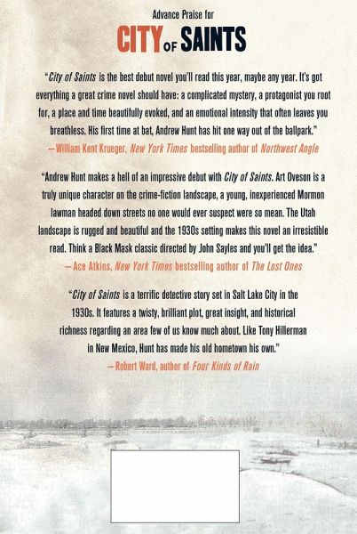 Winner of the 2011 Hillerman Prize, Andrew Hunt's City of Saints is an engaging historical mystery set in 1930s Salt Lake City starring a newly-minted Mormon lawman To the outside observer, Salt Lake City might seem to be the squeaky-clean "City of Saints"-its nickname since Mormon pioneers first arrived. Its wide roads, huge Mormon temple topped by a horn-blowing angel, and orderly neighborhoods give it the appearance of the ideal American city, but looks can be deceiving. When a beautiful socialite turns up dead, Art Oveson, a twenty-something husband, father, and devout Mormon just getting his start as a sheriff's deputy, finds himself thrust into the role of detective. With his partner, a foul-mouthed former strikebreaker, he begins to pursue the murderer-or murderers. His search takes him into the underbelly of Salt Lake City, a place rife with blackmail, corruption, and death. Based on a true yet largely forgotten murder that once captivated the nation but still remains unsolved eighty years later, City of Saints reveals a darker picture of the Mormon capital than you ever expected.