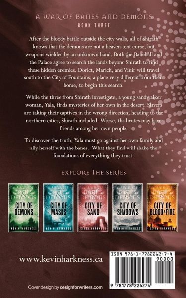 Brought to the brink of destruction by demon attacks, the demonbanes of Shirath fan out across the land, looking for the origin of the beasts. Sent to the sands of the far south, Master Vinir and her apprentices, Marick and Dorict, must survive demons, slavers, a deadly clash of cultures, and each other to find something, anything that will help their city survive. The third book in the series, A War of Banes and Demons, City of Sands is a wide ranging, epic young adult fantasy novel that will leave you dying to know what comes next.