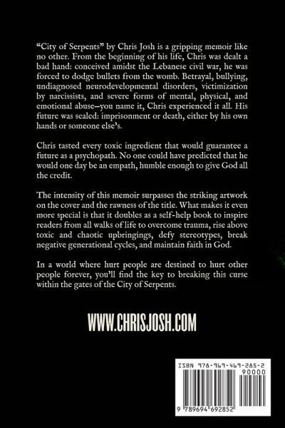 "City of Serpents" by Chris Josh is a gripping memoir like no other. From the beginning of his life, Chris was dealt a bad hand: conceived amidst the Lebanese civil war, he was forced to dodge bullets from the womb. Betrayal, bullying, undiagnosed neurodevelopmental disorders, victimization by narcissists, and severe forms of mental, physical, and emotional abuse-you name it, Chris experienced it all. His future was sealed: imprisonment or death, either by his own hands or someone else's. Chris tasted every toxic ingredient that would guarantee a future as a psychopath. No one could have predicted that he would one day be an empath, humble enough to give God all the credit. The Intensity of this memoir surpasses the striking artwork on the cover and the rawness of the title. What makes it even more special is that it doubles as a self-help book to inspire readers from all walks of life to overcome trauma, rise above toxic and chaotic upbringings, defy stereotypes, break negative generational cycles, and maintain faith in God. In a world where hurt people are destined to hurt other people forever, you'll find the key to breaking this curse within the gates of the City of Serpents.