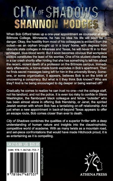 When Bob Gifford takes up a one-year appointment as counselor at elite Biltmore College, Minnesota, he has no idea his life will soon be in danger. Okay, the hostility from most of his colleagues is evident from the outset-as an orphan brought up in a boys' home, with degrees from obscure state colleges in Arkansas and Texas, he will never fit in to their privileged, blue-blood world. But it soon becomes obvious that workplace politics constitutes the least of his worries. One of his student clients dies in a car crash shortly after hinting that she has something to tell him about the recent, violent death of a professor on the Biltmore campus. Immediately afterwards, a home-made bomb explodes in Bob's apartment. Then he finds secret messages being left for him in the university library. Someone, or some organization, it appears, believes Bob is on the brink of uncovering a conspiracy. But what is it they think Bob knows? Who are they? And is he being encouraged to dig deeper or being warned off? Gradually he comes to realize he can trust no one-not the college staff, not his landlord, and not the police. It is even too risky to confide in Steve Washington, the flamboyant black colleague and fellow "outsider" who has been almost alone in offering Bob friendship, or Janet, the spirited Jewish woman with whom Bob has a tantalizing on-off relationship. And just when a new appointment in back-of-beyond Texas appears to offer an escape route, Bob comes closer than ever to death. City of Shadows combines the qualities of a superior thriller with a deep understanding of human nature and insights into the claustrophobic, competitive world of academe. With as many twists as a mountain road, and set-piece confrontations that would have made Hitchcock proud, it is as entertaining as it is compelling.