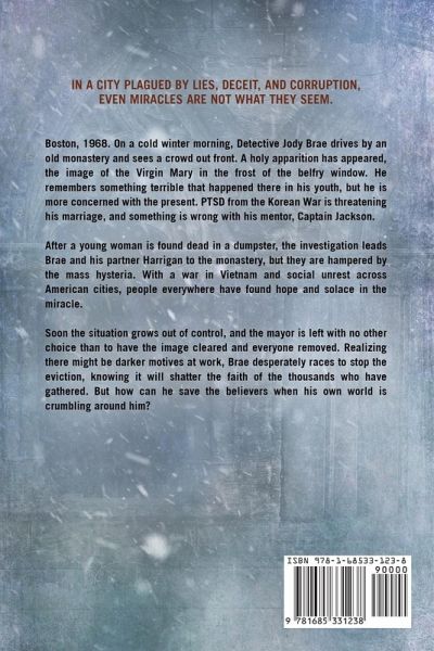 In a city plagued by lies, deceit, and corruption, even miracles are not what they seem. Boston, 1968. On a cold winter morning, Detective Jody Brae drives by an old monastery and sees a crowd out front. A holy apparition has appeared, the image of the Virgin Mary in the frost of the belfry window. He remembers something terrible that happened there in his youth, but he is more concerned with the present. PTSD from the Korean War is threatening his marriage, and something is wrong with his mentor, Captain Jackson. After a young woman is found dead in a dumpster, the investigation leads Brae and his partner Harrigan to the monastery, but they are hampered by the mass hysteria. With a war in Vietnam and social unrest across American cities, people everywhere have found hope and solace in the miracle. Soon the situation grows out of control, and the mayor is left with no other choice than to have the image cleared and everyone removed. Realizing there might be darker motives at work, Brae desperately races to stop the eviction, knowing it will shatter the faith of the thousands who have gathered. But how can he save the believers when his own world is crumbling around him?