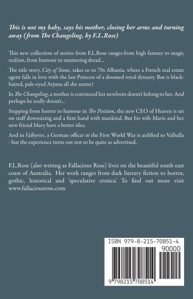 This is not my baby, says his mother, closing her arms and turning away. "We all feel that way at first," lies the nurse, hiding her misgivings, "You'll feel differently once you get used to one another." City of Stone is a new collection of stories from F.L.Rose, dark, funny and lyrical. The title story, City of Stone, takes us to 70s Albania, where a French real estate agent falls in love with the last Princess of a doomed royal dynasty. But is black-haired, pale-eyed Arjuna all she seems? Stepping from horror to humour in The Position, the new CEO of Heaven is set on staff downsizing and a firm hand with mankind. But his wife Mavis and her new friend Mary have a better idea. And in Valkyries, a German officer in the First World War tells his friend the story of how he was airlifted to Valhalla - but the experience turned out not to be quite as advertised in the Aryan press. If you enjoy understated horror with a dash of humour and everyday come-uppance, these stories are for you.