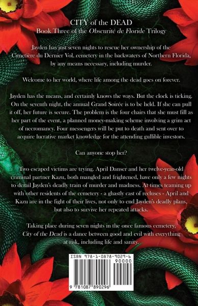 Jayden has just seven nights to rescue her ownership of the Cimetière du Dernier Vol. cemetery in the backwaters of Northern Florida, by any means necessary, including murder. Welcome to her world, where life among the dead goes on forever. Jayden has the means, and certainly knows the ways. But the clock is ticking. On the seventh night, the annual Grand Soirée is to be held. If she can pull it off, her future is secure. The problem is the four chairs that she must fill as her part of the event, a planned money-making scheme involving a grim act of necromancy. Four messengers will be put to death and sent over to acquire lucrative market knowledge for the attending gullible investors. Can anyone stop her? Two escaped victims are trying. April Danser and her twelve-year-old criminal partner Kazu, both mangled and frightened, have only a few nights to derail Jayden's deadly train of murder and madness. At times teaming up with other residents of the cemetery - a ghastly cast of recluses - April and Kazu are in the fight of their lives, not only to end Jayden's deadly plans, but also to survive her repeated attacks. Taking place during seven nights in the once famous cemetery, City of the Dead is a dance between good and evil with everything at risk, including life and sanity.