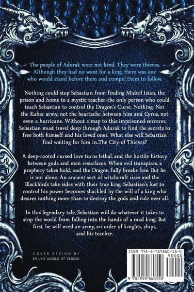 The people of Adurak were not kind. They were thieves. Although they had no want for a king, there was one who would stand before them and compel them to follow. Nothing could stop Sebastian from finding Midrel Istan, the prison and home to a mystic teacher-the only person who could teach Sebastian to control the Dragon's Curse. Nothing. Not the Kuhar army, not the heartache between him and Cyrus, not even a hurricane. Without a map to this imprisoned sorcerer, Sebastian must travel deep through Adurak to find the secrets to free both himself and his loved ones. What else will Sebastian find waiting for him in..The City of Thieves? A deep-rooted cursed love turns lethal, and the hostile history between gods and men resurfaces. When evil transpires, a prophecy takes hold, and the Dragon fully breaks free. But he is not alone. An ancient sect of witchcraft rises and the Blackbirds take sides with their true king. Sebastian's lust to control his power becomes shackled by the will of a king who desires nothing more than to destroy the gods and rule over all. In this legendary tale, Sebastian will do whatever it takes to stop the world from falling into the hands of a mad king. But first, he will need an army, an order of knights, ships, and his teacher.