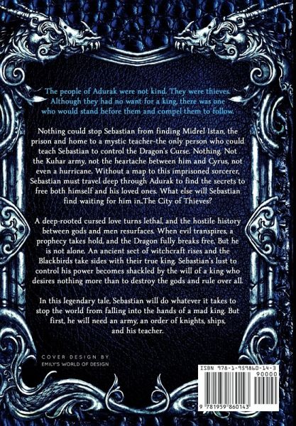 The people of Adurak were not kind. They were thieves. Although they had no want for a king, there was one who would stand before them and compel them to follow. Nothing could stop Sebastian from finding Midrel Istan, the prison and home to a mystic teacher-the only person who could teach Sebastian to control the Dragon's Curse. Nothing. Not the Kuhar army, not the heartache between him and Cyrus, not even a hurricane. Without a map to this imprisoned sorcerer, Sebastian must travel deep through Adurak to find the secrets to free both himself and his loved ones. What else will Sebastian find waiting for him in..The City of Thieves? A deep-rooted cursed love turns lethal, and the hostile history between gods and men resurfaces. When evil transpires, a prophecy takes hold, and the Dragon fully breaks free. But he is not alone. An ancient sect of witchcraft rises and the Blackbirds take sides with their true king. Sebastian's lust to control his power becomes shackled by the will of a king who desires nothing more than to destroy the gods and rule over all. In this legendary tale, Sebastian will do whatever it takes to stop the world from falling into the hands of a mad king. But first, he will need an army, an order of knights, ships, and his teacher.