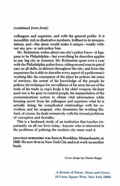 This landmark 1973 study of city policemen portrays in detail work "on the street,"the way police regard their work, the way they deal day-by-day with suspects and criminals, with colleague and superiors, and with the general public. Jonathan Rubinstein spent over a year with the Philadelphia police force, riding second man in patrol cars on all shifts, and from this experience he describes every aspects of a policeman's working life: his conception of the place he polices; his sense of territory; the extent of his knowledge of the people he polices; his technique for surveillance of his area; his use of the tools of the trade to control people; his complicated relationships with his coworkers and his sergeant, who dominates his working life. And, of course, he deals extensively with the eternal problems of corruption and brutality. Written with great insight and without pro- or anti-police bias, City Police is rich in illustrative incidents and serves as an excellent model for future studies of police work.