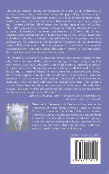 "As Thomas L. Dynneson's pioneering research has demonstrated, we simply cannot understand the politics of any age without recognizing how each society uses laws, education, and social norms to promote a particular vision of civism. Dynneson continues his unparalleled work in civism by turning to ancient Athens as the source for state-sponsored education whose purpose is to cultivate people into citizen-subjects. Dynneson provides a rich account of the various intellectual and political forces, including those we now call sophistic and philosophical, that create a vision of how laws, tradition, and pedagogy function to produce the ideal citizen. This book will be of interest to any reader with a serious interest in civism, which ought to be all of us." (Edward Schiappa, Paul W. Frenzel Chair of Liberal Arts, The University of Minnesota)