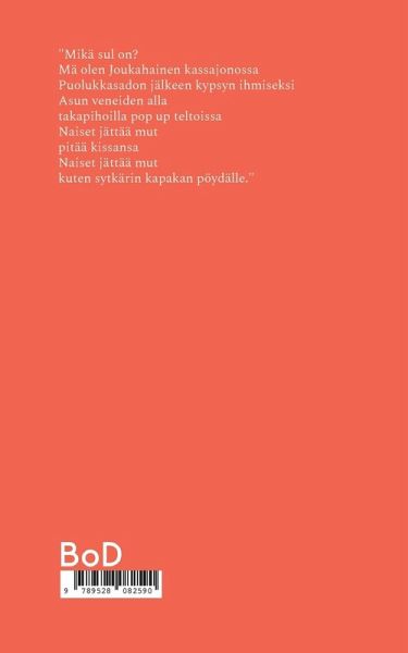 "Mikä sul on? Mä olen Joukahainen kassajonossa Puolukkasadon jälkeen kypsyn ihmiseksi Asun veneiden alla takapihoilla pop up teltoissa Naiset jättää mut pitää kissansa Naiset jättää mut kuten sytkärin kapakan pöydälle."