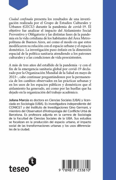 Ciudad confinada presenta los resultados de una investigación realizada por el Grupo de Estudios Culturales y Urbanos (GECU) durante la pandemia de covid-19. El objetivo fue analizar el impacto del Aislamiento Social Preventivo y Obligatorio y las distintas fases de la pandemia en la vida cotidiana de los habitantes del Área Metropolitana de Buenos Aires, así como el modo en que estos modificaron su relación con el espacio urbano y el espacio doméstico. La investigación puso énfasis en la dimensión espacial de la política sanitaria atendiendo a los patrones culturales y a las condiciones de vida preexistentes.A más de tres años del estallido de la pandemia ¿y con el fin de la emergencia sanitaria global por covid-19 declarado por la Organización Mundial de la Salud en mayo de 2023¿, cabe continuar preguntándonos por la permanencia de los cambios observados en las prácticas urbanas y en los usos de los espacios públicos y domésticos que el aislamiento ha generado, así como por las huellas que ha dejado en la organización del trabajo académico. Juliana Marcús es doctora en Ciencias Sociales (UBA) y licenciada en Sociología (UBA). Es investigadora independiente del CONICET y del Instituto de Investigaciones Gino Germani, y miembro del Observatori d'Antropologia del Conflicte Urbà de Barcelona. Es profesora adjunta en la carrera de Sociología de la Facultad de Ciencias Sociales de la UBA. Sus estudios se focalizan en la producción del espacio urbano, el impacto social de las transformaciones urbanas y los usos diferenciales de la ciudad.