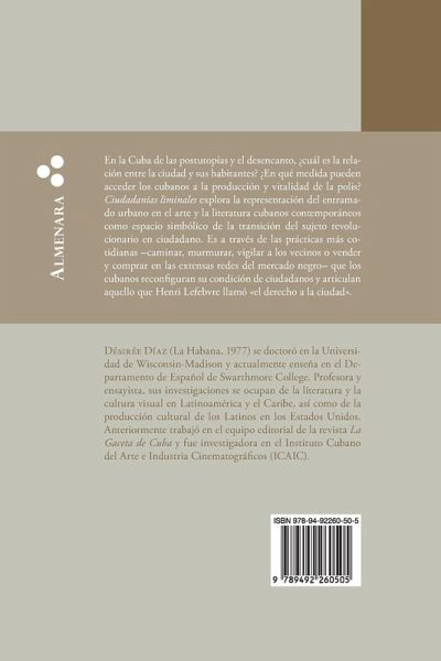 En la Cuba de las postutopías y el desencanto, ¿cuál es la relación entre la ciudad y sus habitantes? ¿En qué medida pueden acceder los cubanos a la producción y vitalidad de la polis? Ciudadanías liminales explora la representación del entramado urbano en el arte y la literatura cubanos contemporáneos como espacio simbólico de la transición del sujeto revolucionario en ciudadano. Es a través de las prácticas más cotidianas -caminar, murmurar, vigilar a los vecinos o vender y comprar en las extensas redes del mercado negro- que los cubanos reconfiguran su condición de ciudadanos y articulan aquello que Henri Lefebvre llamó el derecho a la ciudad. Désirée Díaz (La Habana, 1977) se doctoró en la Universidad de Wisconsin-Madison y actualmente enseña en el Departamento de Español de Swarthmore College. Profesora y ensayista, sus investigaciones se ocupan de la literatura y la cultura visual en Latinoamérica y el Caribe, así como de la producción cultural de los Latinos en los Estados Unidos. Anteriormente trabajó en el equipo editorial de la revista La Gaceta de Cuba y fue investigadora en el Instituto Cubano del Arte e Industria Cinematográficos (ICAIC).