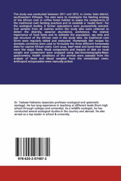 This study was conducted between 2011 and 2013, in Limmu Seka district, southwestern Ethiopia. The aims were to investigate the feeding ecology of the African civet in coffee forest habitat to assess the components of the traditional civet farming practices and to establish a 'model farm'. For the ecological studies, 6 farmer associations were purposefully selected. Scat samples from all civetries within the study sites were collected to detect the diversity, seasonal abundance, preference, the relative importance of food items and to estimate the population, sex ratio and age structure of the African civet in the study sites. Six traditional civet farms were regularly visited and evaluated. Homemade diet recipes for domestic carnivores were used to formulate the three different homemade diets for captive African civets. Corn soup, beef meat and bone-meat meals were the major items. Musk components and impacts of diet on musk weight and component were analyzed using Gas-chromatography-Mass-spectrometry. Health conditions of the animals were assessed from the analysis of feces and blood sampled from the immobilized civets. Arthropod ectoparasites were manually picked.