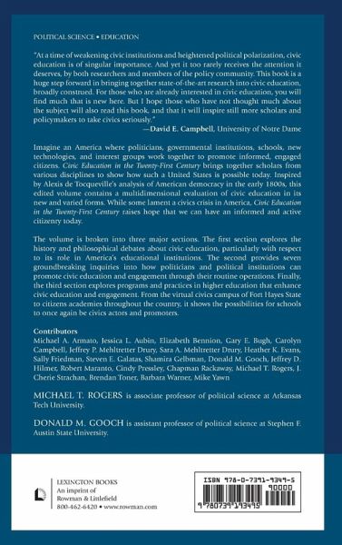 Imagine an America where politicians, governmental institutions, schools, new technologies, and interest groups work together to promote informed, engaged citizens. Civic Education in the Twenty-First Century brings together scholars from various disciplines to show how such a United States is possible today. Inspired by Alexis de Tocqueville’s analysis of American democracy in the early 1800s, this edited volume represents a multidimensional evaluation of civic education in its new and varied forms. While some lament a civics crisis in America today, Civic Education in the Twenty-First Century raises hope that we can have an informed and active citizenry. We find the activities of a number of politicians, government institutions, schools and interest groups as promising developments in the struggle to educate and engage Americans in their democracy. New technologies and new innovations in civic education have laid the foundation for a revitalized American civic ecology. With Civic Education in the Twenty-First Century, we call for the United States to make these practices less isolated and more common throughout the county. The volume is broken into three major sections. First there are four chapters exploring the history and philosophical debates about civic education, particularly with respect to its role in America’s educational institutions. Then, the second section provides seven groundbreaking inquiries into how politicians and political institutions can promote civic education and engagement through their routine operations. As some examples, this section explores how politicians through campaigns and judiciaries through community programs enhance civic knowledge and encourage civic engagement. This section also explores how new technologies like the Internet and social media are increasingly used by government institutions and other entities to encourage a more politically informed and engaged citizenry. Finally, the third section contains six chapters that explore programs and practices in higher education that are enhancing civic education, engagement and our knowledge of them. From the virtual civics campus of Fort Hayes State to citizens’ academies throughout the country, this section shows the possibilities for schools today to once again be civics actors and promoters.