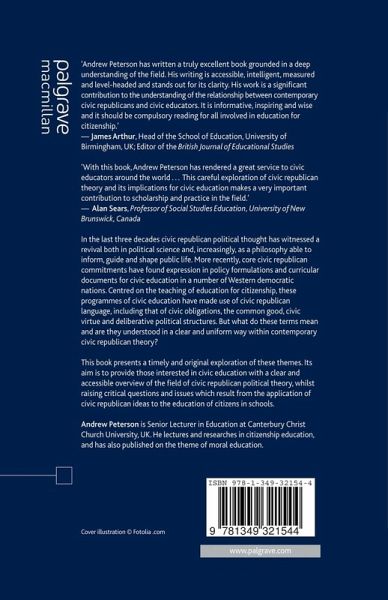 'Andrew Peterson has written a truly excellent book grounded in a deep understanding of the field. His writing is accessible, intelligent, measured and level-headed and stands out for its clarity. His work is a significant contribution to the understanding of the relationship between contemporary civic republicans and civic educators. It is informative, inspiring and wise and it should be compulsory reading for all involved in education for citizenship'. - James Arthur, Head of the School of Education, University of Birmingham, UK; Editor of the British Journal of Educational Studies 'With this book, Andrew Peterson has rendered a great service to civic educators around the world...This careful exploration of civic republican theory and its implications for civic education makes a very important contribution to scholarship and practice in the field. - Professor Alan Sears, Professor of Social Studies Education, University of New Brunswick, Canada '...I can wholeheartedly recommend his book to those interested in finding out more about modern republicamism. It would also be of benefit to those already interested in civic education because it parents a rich context (the republican perspective) in which the development of civic education makes sense.' - Geoffrey Hinchliffe, University of East Anglia, Journal of Philosophy of Education