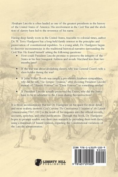 Abraham Lincoln is often lauded as one of the greatest presidents in the history of the United States of America. His involvement in the Civil War and the abolition of slavery have led to the reverence of his name. Having deep family roots in the United States, traceable to colonial times, author Dr. W. Terry Hardgrave has a long-held family interest in the principles and preservation of constitutional republics. As a young adult, Dr. Hardgrave began to discover inconsistencies in the traditional historical narrative surrounding the Civil War. He found himself asking the following questions: How could President Lincoln promise to preserve the integrity of the States in his first Inaugural Address and invade Maryland less than two months later? If the war was about abolishing slavery, why was General Grant’s wife a slave-holder during the war? If John Wilkes Booth was simply a pro-slavery Southern sympathizer, why did he yell, “Sic Semper Tyrannis,” after shooting President Lincoln instead of “Slavery Forever” or “Dixie Forever” or something similar? If President Lincoln actually preserved the Union, why did the States have to be re-admitted to the Union during Reconstruction? It is those inconsistencies that led Dr. Hardgrave on his quest for more detail and more realistic answers. Civil Coercion: The Constitutional Violations of the Lincoln Administration (1861-1865) is the result of his inquiries into the official records, accounts, speeches, and other publications. Through this book, Dr. Hardgrave hopes to prompt readers into their own research by providing them with facts, using a minimum of biased opinion, regarding the Constitutional violations of the Lincoln administration.