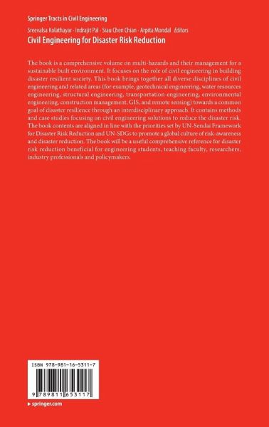 The book is a comprehensive volume on multi-hazards and their management for a sustainable built environment. It focuses on the role of civil engineering in building disaster resilient society. This book brings together all diverse disciplines of civil engineering and related areas (for example, geotechnical engineering, water resources engineering, structural engineering, transportation engineering, environmental engineering, construction management, GIS, and remote sensing) towards a common goal of disaster resilience through an interdisciplinary approach. It contains methods and case studies focusing on civil engineering solutions to reduce the disaster risk. The book contents are aligned in line with the priorities set by UN-Sendai Framework for Disaster Risk Reduction and UN-SDGs to promote a global culture of risk-awareness and disaster reduction. The book will be a useful comprehensive reference for disaster risk reduction beneficial for engineering students, teaching faculty, researchers, industry professionals and policymakers.