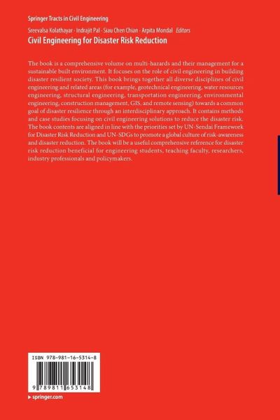 The book is a comprehensive volume on multi-hazards and their management for a sustainable built environment. It focuses on the role of civil engineering in building disaster resilient society. This book brings together all diverse disciplines of civil engineering and related areas (for example, geotechnical engineering, water resources engineering, structural engineering, transportation engineering, environmental engineering, construction management, GIS, and remote sensing) towards a common goal of disaster resilience through an interdisciplinary approach. It contains methods and case studies focusing on civil engineering solutions to reduce the disaster risk. The book contents are aligned in line with the priorities set by UN-Sendai Framework for Disaster Risk Reduction and UN-SDGs to promote a global culture of risk-awareness and disaster reduction. The book will be a useful comprehensive reference for disaster risk reduction beneficial for engineering students, teaching faculty, researchers, industry professionals and policymakers.