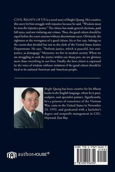 Civil Rights of US is a novel story of Bright Quang. He's creative; this story let him struggle with injustice because he said, "Wisdom must be won the injustice power." The citizen has made general elections, paid full taxes, and not violating any crimes. Thus, the good citizen should be equal before the court systems without discriminate races. Obviously, the rightness or the wrongness of a good citizen, his or her case, belongs to the courts that decided but not to the clerk of the United States Justice Department. He says, "Perform justice, which is peaceful, but anti-justice, as demagogy." Moreover, we live in modern society. When we are struggling to seek the justice within our sharp pen, we are glorious more than everything in our lives. Finally, the best citizen is expressed by the voice of wisdom without violations if the good citizen should be loyal to its national American and American people.