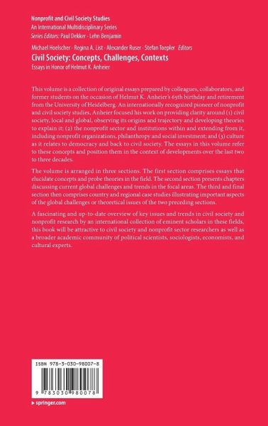 This volume is a collection of original essays prepared by colleagues, collaborators, and former students on the occasion of Helmut K. Anheier's 65th birthday and retirement from the University of Heidelberg. An internationally recognized pioneer of nonprofit and civil society studies, Anheier focused his work on providing clarity around (1) civil society, local and global, observing its origins and trajectory and developing theories to explain it; (2) the nonprofit sector and institutions within and extending from it, including nonprofit organizations, philanthropy and social investment; and (3) culture as it relates to democracy and back to civil society. The essays in this volume refer to these concepts and position them in the context of developments over the last two to three decades.