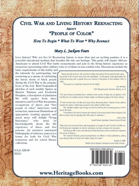 Love history? Why not live it? Reenacting history is more than just an exciting pastime; it is a powerful educational medium that breathes life into our heritage. This guide will inspire African-Americans to attend Civil War battle reenactments and join in the living history experience as reenactors representing either military roles or civilians in non-combat roles. Discussions include the basic requirements of this hobby and the rationale for participating, but reenacting as a means of celebrating the heroic deeds of black people during the Civil War is the primary focus of the text. Brief biographical sketches of such notable figures as Harriet Tubman and Frederick Douglass, a description of plantation life with quotes from slave narratives and Civil War documents, occupations of slaves and "free people of color," interviews with reenactors, numerous illustrations of appropriate wearing apparel, and much more will delight "living historians," who must be knowledgeable about the life experience of slaves and free persons. An extensive annotated bibliography of reference sources is a bonus for both for Civil War reenactors and for school library collections.