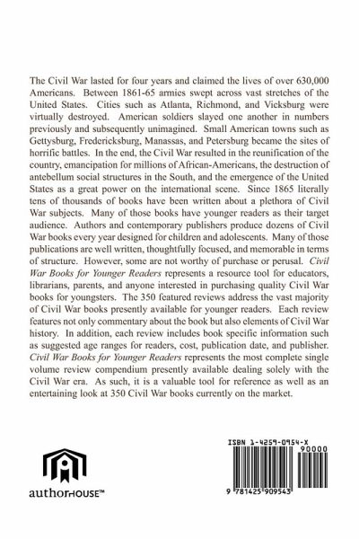 The Civil War lasted for four years and claimed the lives of over 630,000 Americans. Between 1861-65 armies swept across vast stretches of the United States. Cities such as Atlanta, Richmond, and Vicksburg were virtually destroyed. American soldiers slayed one another in numbers previously and subsequently unimagined. Small American towns such as Gettysburg, Fredericksburg, Manassas, and Petersburg became the sites of horrific battles. In the end, the Civil War resulted in the reunification of the country, emancipation for millions of African-Americans, the destruction of antebellum social structures in the South, and the emergence of the United States as a great power on the international scene. Since 1865 literally tens of thousands of books have been written about a plethora of Civil War subjects. Many of those books have younger readers as their target audience. Authors and contemporary publishers produce dozens of Civil War books every year designed for children and adolescents. Many of those publications are well written, thoughtfully focused, and memorable in terms of structure. However, some are not worthy of purchase or perusal. Civil War Books for Younger Readers represents a resource tool for educators, librarians, parents, and anyone interested in purchasing quality Civil War books for youngsters. The 350 featured reviews address the vast majority of Civil War books presently available for younger readers. Each review features not only commentary about the book but also elements of Civil War history. In addition, each review includes book specific information such as suggested age ranges for readers, cost, publication date, and publisher. Civil War Books for Younger Readers represents the most complete single volume review compendium presently available dealing solely with the Civil War era. As such, it is a valuable tool for reference as well as an entertaining look at 350 Civil War books currently on the market
