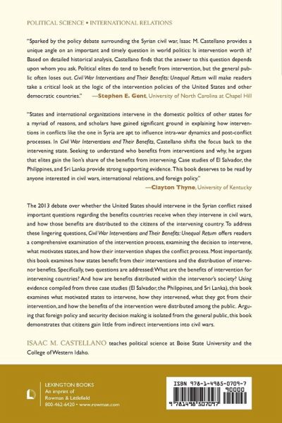 The 2013 debate over whether the United States should intervene in the Syrian conflict raised important questions regarding the benefits countries receive when they intervene in civil wars, and how those benefits are distributed to the citizens of the intervening country. To address these lingering questions this book offers readers a comprehensive examination of the intervention process, examining the decision to intervene, what motivates states, and how their intervention shapes the conflict process. Most, importantly, the book examines how states benefit from their interventions and the distribution of intervenor benefits. Specially two questions are addressed: What are the benefits of intervention for intervening countries? And, how are benefits distributed within the intervenors society? Using evidence compiled from three case studies (El Salvador, The Philippines, and Sri Lanka), this book examines what motivated states to intervene, how they intervened, what they got from their intervention, and how the benefits of the intervention were distributed among the public. Arguing that foreign policy and security decision making is isolated from the general public, this book argues that citizens gain little from indirect interventions into civil wars.