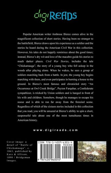 Popular American writer Ambrose Bierce comes alive in the magnificent collection of short stories. Having been no stranger to the battlefield, Bierce draws upon his experience as a soldier and the stories he heard during the American Civil War in this collection. However, his tales do not happily reminisce about the good times; instead, Bierce’s dry wit and love of the macabre guide his stories to much darker places. "Civil War Stories", includes the tale "Chickamauga", the story of a young boy who fell asleep in the woods after playing alone. When he wakes, he sees a group of soldiers marching back from a battle. In jest, the young boy begins marching with them, and even participates in burning a house to the ground. In Bierce’s most famous and chronicled story "An Occurrence at Owl Creek Bridge", Peyton Farquhar, a Confederate sympathizer, is tricked by Union soldiers and is hanged in front of his wife and children. Somehow, though he manages to escape his noose and is able to run far away from the frenzied scene. Regardless of which of the sixteen stories included in this collection that you read, you will be amazed at Bierce’s ability to spin a short, suspenseful tale about one of the most tumultuous times in American history. This edition is printed on premium acid-free paper.