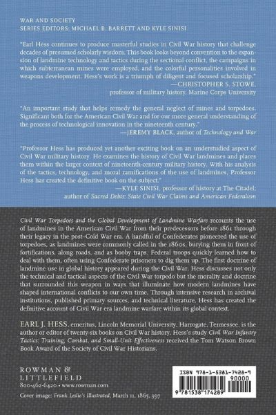 Civil War Torpedoes and the Global Development of Landmine Warfare recounts the use of landmines in the American Civil War from their predecessors before 1861 through their legacy in the post-Cold War era. A handful of Confederates pioneered the use of torpedoes, as landmines were commonly called in the 1860s, burying them in front of fortifications, along roads, and as booby traps. Federal troops quickly learned how to deal with them, often using Confederate prisoners to dig them up. The first doctrine of landmine use in global history appeared during the Civil War. Hess discusses not only the technical and tactical aspects of the Civil War torpedo, but the morality and doctrine that surrounded this weapon in ways that illuminate how modern landmines have shaped international conflicts to our own time. Through intensive research in archival institutions, published primary sources, and technical literature, Hess has created the definitive account of Civil War era landmine warfare within its global context.
