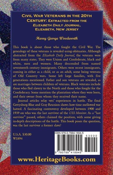 This book is about those who fought the Civil War. The genealogy of these veterans is revealed using obituaries. Although abstracted from the Elizabeth Daily Journal, the vets were from many states. They were Union andConfederate, black and white, men and women. Many descended from named 17th century immigrants. Others were recent immigrants, coming in either as a child, or as an adult, some being vets of Old Country wars. Some left large families, with 5 generations mentioned. Father and son vets are revealed, as are marriages between children of vets. Black vets include those who fled slavery to the North and those who fought for the Confederacy. Some mention the plantation where they were born, and their owner from whom they received their name. Journal articles relay vets' experiences in battle. The final Gettysburg Blue and Gray Reunion shows how time mellowed war hatred. A fascinating controversy developed between 1900 and 1939 on who was the last survivor of the USS Monitor. As a "last survivor" passed, others claimed the position, with some giving in-depth descriptions of the battle. This book poses the question, was the last survivor a former slave?